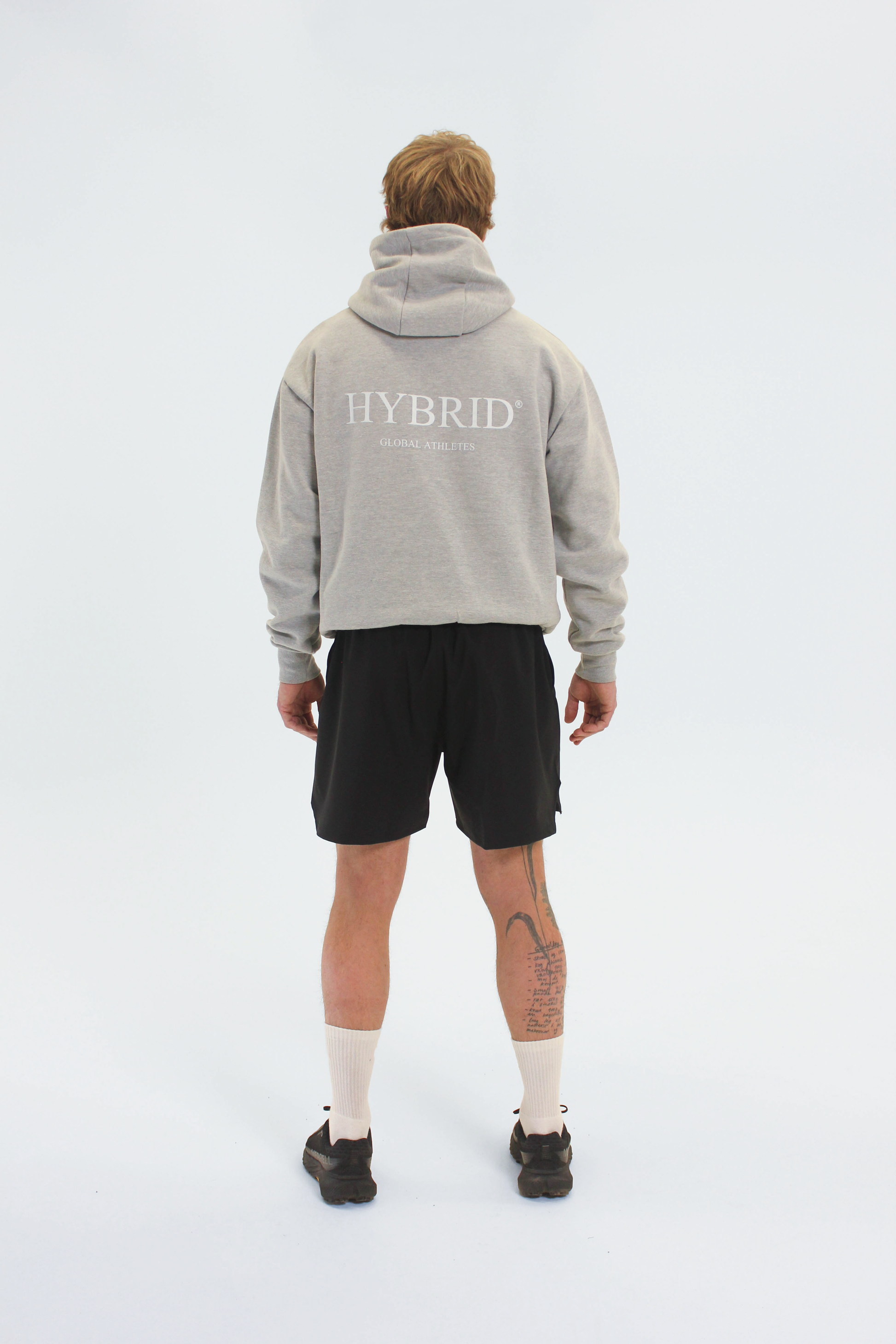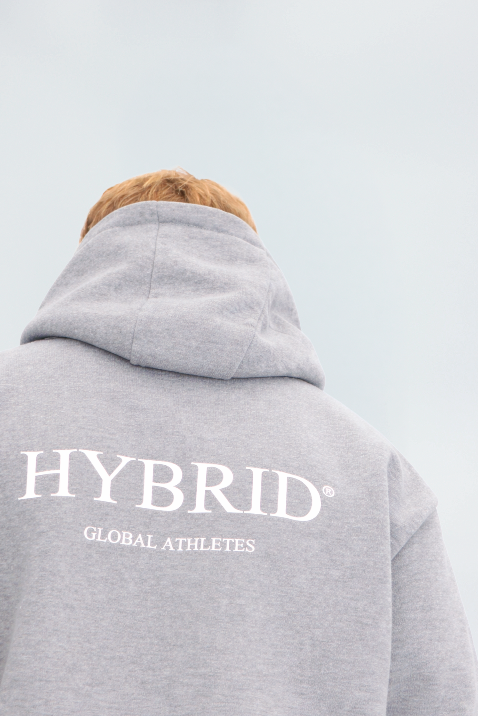 Grå Heavyweight hoodie med hvidt logo på ryggen.